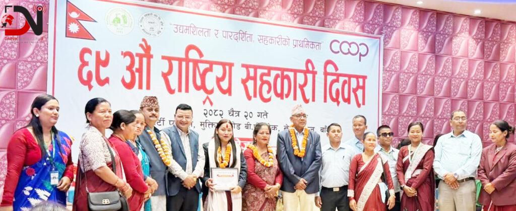 त्यसैगरी, उत्कृष्ट सहकारीकर्मीका रूपमा ग्रामीण विद्युत सहकारी संस्थाकी व्यवस्थापक कल्पना बस्नेतलाई पुरस्कृत गरिएको छ भने जिल्ला सहकारी संघतर्फ उत्कृष्ट कर्मचारीका रूपमा अस्मिता मल्ल सम्मानित भएको प्रमुख कार्यकारी अधिकृत उपाध्यायले बताए ।