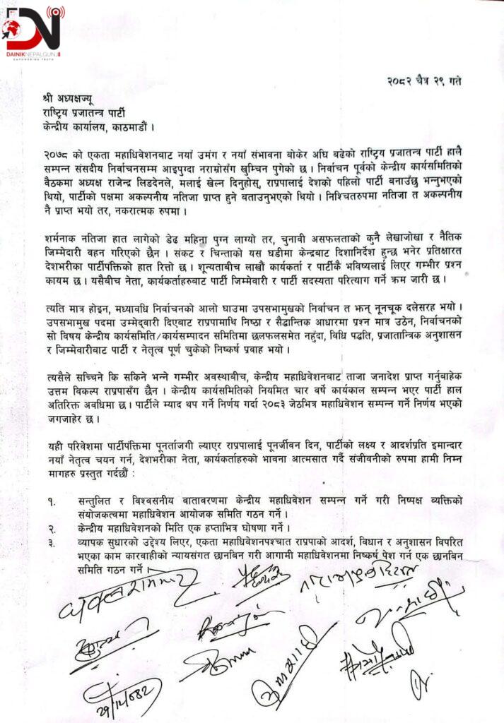 राष्ट्रिय प्रजातन्त्र पार्टी (राप्रपा) को केन्द्रीय समिति भंग गरी महाधिवेशनमा जान माग गरिएको छ । राप्रपाको असन्तुष्ट पक्षले अध्यक्ष राजेन्द्र लिङ्देनको नेतृत्वको समितिलाई भंग गर्न माग गरेको छ ।