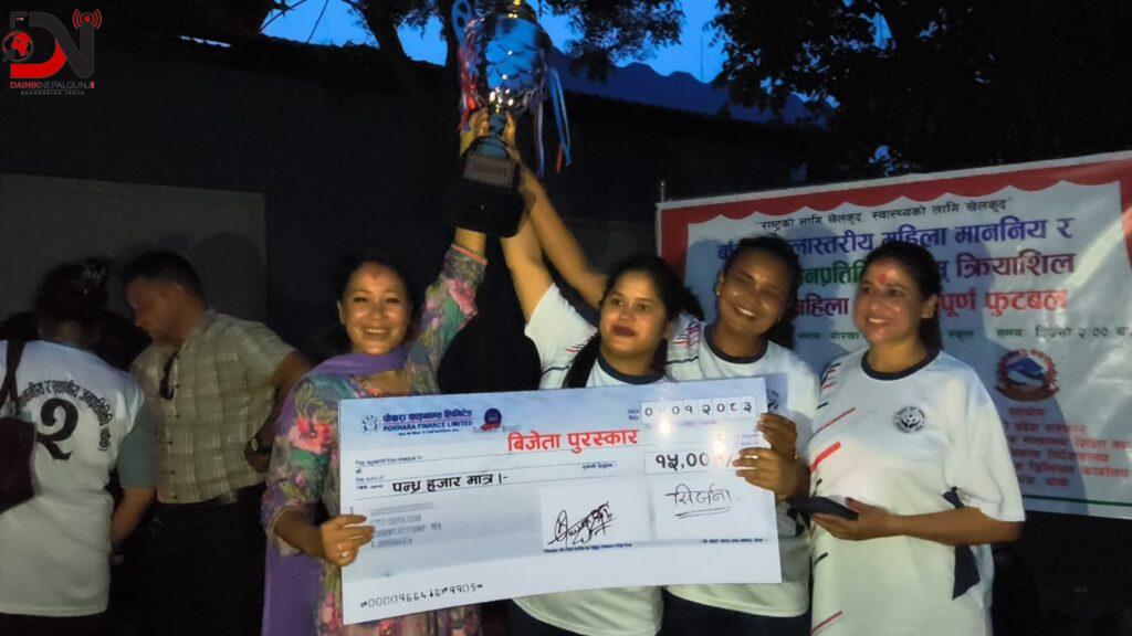 गोर्खा युनाइटेड स्कुल कोहलपुरको मैदानमा आयोजना गरिएको खेलमा विजेता पत्रकार महिलाको टोलीलाई ट्रफी सहित नगद रू १५ हजार र उपविजेता जनप्रतिनिधि महिलाको टिमलाई नगद रु ५ हजार प्रदान गरिएको छ।