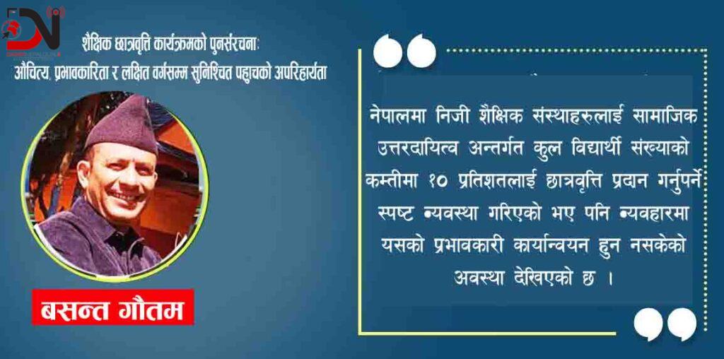 नेपालमा शैक्षिक अधिकारको संरक्षण, शैक्षिक समानता, सामाजिक न्याय र समावेशीताको लक्ष्य हासिल गर्ने प्रमुख माध्यमका रूपमा विभिन्न प्रकारका छात्रवृत्ति कार्यक्रमहरू कार्यान्वयनमा रहेका छन् । विशेष गरी दलित समुदायका छात्रछात्रा तथा गैरदलित छात्रा लक्षित वार्षिक रु ४०० छात्रवृत्ति कार्यक्रम राज्यको सकारात्मक विभेद को एउटा महत्वपूर्ण अभ्यास हो, जसले ऐतिहासिक रूपमा वञ्चित र सीमान्तकृत समुदायलाई शिक्षामा पहुँच विस्तार गर्ने उद्देश्य राख्दछ । यद्यपि, समयको परिवर्तन, आर्थिक अवस्थाको उतारचढाव तथा शैक्षिक आवश्यकताको विस्तारसँगै यस्ता कार्यक्रमहरूको औचित्य र प्रभावकारिता पुनः मूल्याङ्कन गर्नुपर्ने अवस्था सिर्जना भएको छ । वर्तमान अवस्थामा अत्यन्त न्यून रकमको छात्रवृत्ति, कमजोर कार्यान्वयन र अपारदर्शी वितरण प्रणालीका कारण यी कार्यक्रमहरू आफ्नो मूल उद्देश्य हासिल गर्न नसकेको यथार्थ विभिन्न अध्ययन तथा व्यवहारिक अनुभवबाट पुष्टि हुँदै आएको छ ।