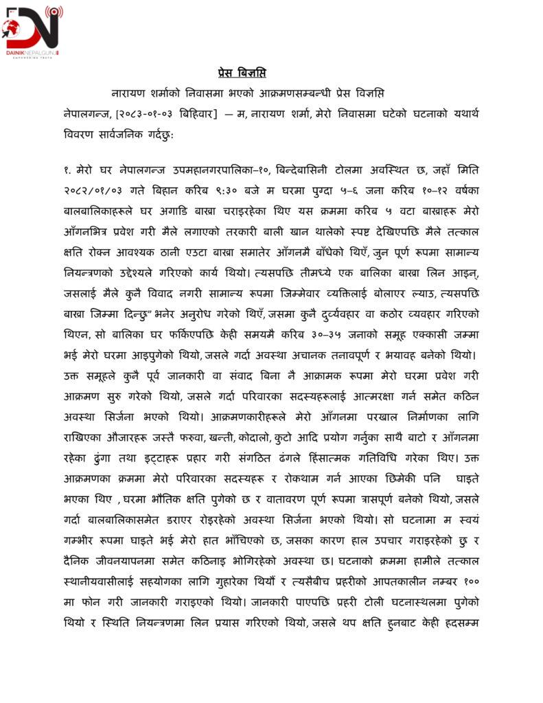 शर्माको बारीमा केही परका छिमेकीको बाख्राले तरकारी बाली खाएको विषयमा उत्पन्न विवाद चर्काएर आफुमाथि नै आक्रमण भएको घटनाबारे प्रहरीले अनुसन्धान गरिरहेको र त्यसबाटै आफुले न्याय पाउने विश्वासका साथ बसिरहँदा घटनालाई अतिरञ्जित बनाएर एक समूहले अराजकता मच्चाउने प्रपञ्च गरिरहेको आरोप शर्माको छ ।