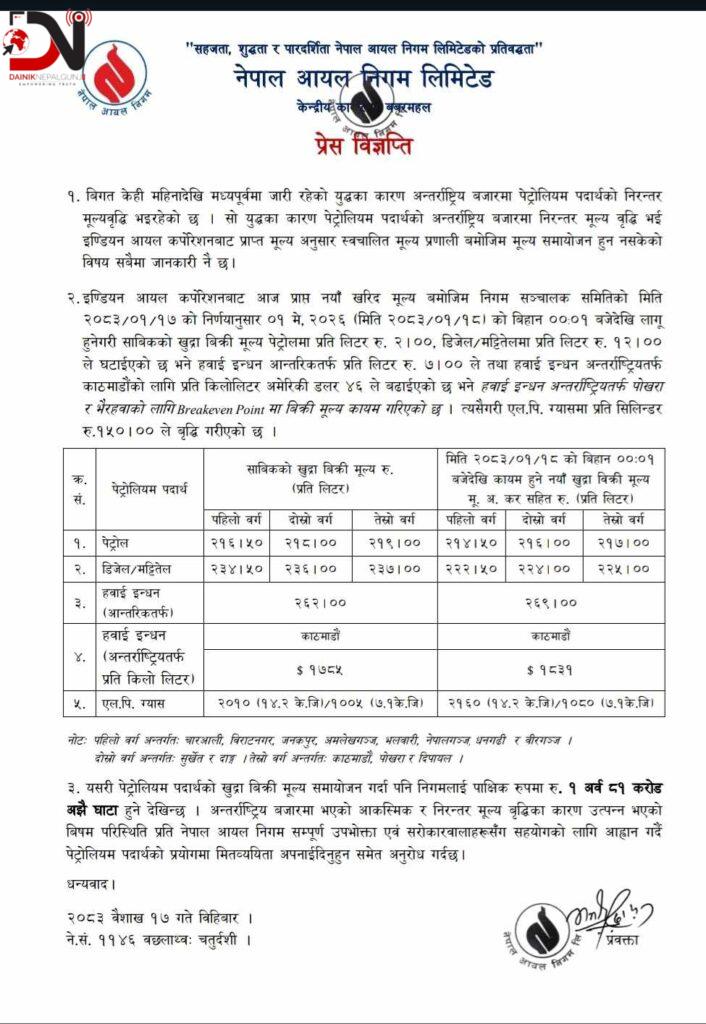 जस अनुसार, अब खाना पकाउने ग्यासको मूल्य २ हजार १ सय ६० रुपैयाँ पुगेको निगमले जनाएको छ । निगमका अनुसार, आधा सिलिण्डर ग्यासको मूल्य १ हजार ८० तोकिएको छ ।