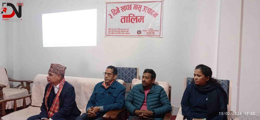 नेपालगन्जका मासु व्यवसायीलाई स्वच्छ मासु उत्पादन तालिम दिन थालिएको छ । उपभोक्ताको भान्सासम्म स्वस्थ र गुणस्तरीय मासु पुगोस् भन्ने उद्देश्यले नेपालगन्ज उपमहानगरपालिकाले मासु व्यवसायीलाई स्वच्छ मासु उत्पादन तालिम दिन सुरु गरेको हो । पशु सेवा शाखाको आयोजनामा तालिम दिइएको हो । पहिलो चरणमा वडा नम्बर ४ का १५ जना मासु व्यवसायीलाई तीन दिने तालिम दिइएको पशु सेवा शाखा प्रमुख लक्ष्मी शाहीले बताइन् ।