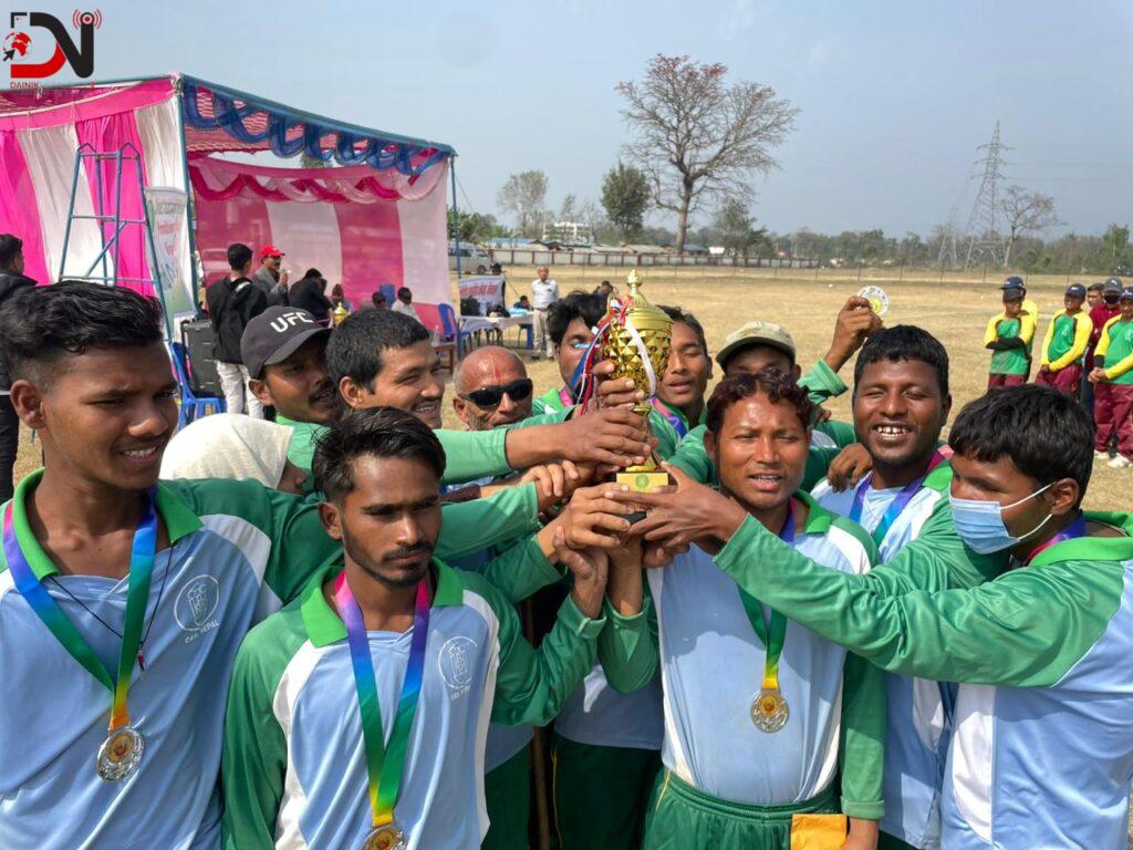 नेत्रहीन क्रिकेट संघ नेपाले बाँकेको कोहलपुरमा आयोजना गरेको नेत्रहीन क्रिकेट प्रतियोगिता २०२४को उपाधी कञ्चनपुरको टोलीले हात पारेको छ । मंगलबार भएको फाइनल खेलमा दृष्टिविहीन क्रिकेट संघ कञ्चनपुरले बर्दिया नेत्रहीन क्रिकेट संघको टोलीलाई १ सय ६ रनले पराजित गरेको हो ।