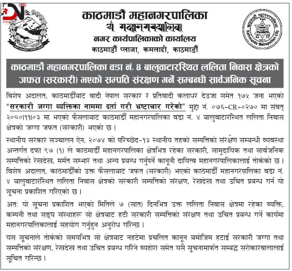 काठमाडौं महानगरपालिकाले वडा नम्बर ४ बालुवाटारमा रहेको ललिता निवास क्षेत्रको सरकारी जग्गाबाट आफैँ हट्न व्यक्ति, कम्पनी र सङ्घसंस्थाहरुलाई अनुरोध गरेको छ । आज सार्वजनिक सूचना निकालेर महानगरपालिकाले ७ दिनको अवधि दिएर सार्वजनिक सम्पत्तिको संरक्षण गर्न सहयोगका लागि अनुरोध गरेको हो ।