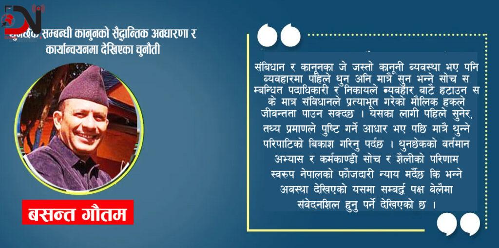 संबिधान र कानूनका जे जस्तो कानूनी ब्यवस्था भए पनि ब्यवहारमा पहिले थुन अनि मात्रै सुन भन्ने सोच सम्बन्धित पदाधिकारी र निकायले व्यवहार बाटै हटाउन सके मात्र संविधानले प्रत्याभूत गरेको मौलिक हकले जीवन्तता पाउन सक्दछ । यसका लागी पहिले सुनेर, तथ्य प्रमाणले पुष्टि गर्ने आधार भए पछि मात्रै थुन्ने परिपाटिको बिकाश गरिनु पर्दछ । थुनछेकको वर्तमान अभ्यास र कर्मकाण्डी सोच र शैलीको परिणाम स्वरूप नेपालको फÞौजदारी न्याय मर्दैछ कि भन्ने अवस्था देखिएको यसमा सम्बद्र्ध पक्ष बेलैमा संवेदनशिल हुनु पर्ने देखिएको छ ।