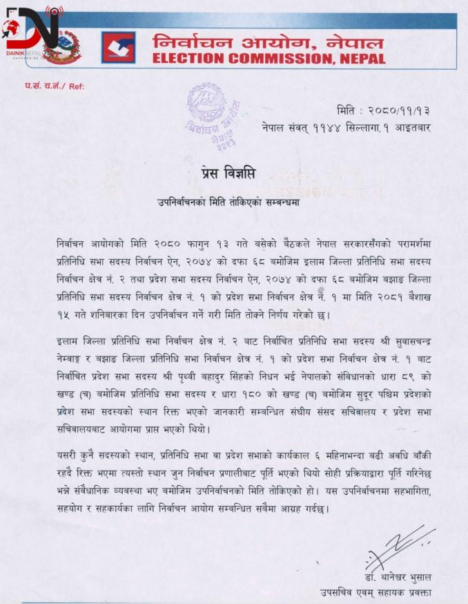 निर्वाचन आयोगले ०८१ वैशाख १५ गते उपनिर्वाचन गर्ने घोषणा गरेको छ । नेपाल सरकारसँगको परामर्शमा निर्वाचन आयोगले उपनिर्वाचन मिति घोषणा गरेको हो ।