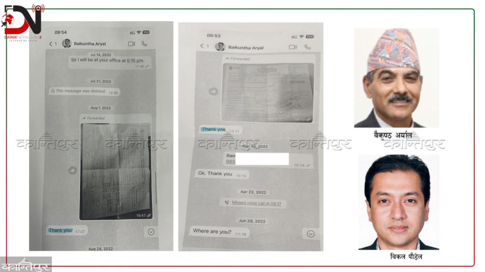 पौडेल र अर्यालबीच ‘ह्वाट्सएप’ मा नियमित सन्देश आदानप्रदान हुने गरेको, सरकारी फाइल आदानप्रदान भएको र अर्यालले बैंक खाता नम्बर पठाएपछि विकलले क्रमशः ५ लाख र ९ लाख रुपैयाँ दिलाएको देखिन्छ । दुवै पटक तत्कालीन सञ्चार सचिव अर्यालले तोकेका मानिसको बैंक खातामा रकम जम्मा भएको भौचर पनि कान्तिपुरले प्राप्त गरेको छ ।