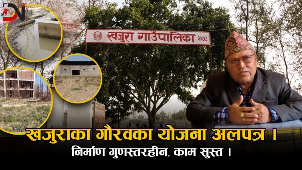 हल्ला बढी काम कम भनेजस्तै भएको छ खजुराका गौरवका योजनाहरूको हालत । बाँकेको नगरउन्मुख गाउँपालिका खजुरामा स्थानीय सरकारको पहिलो कार्यकालमा सातवटा योजनालाई गौरवका योजना भनेर अघि बढाइएको थियो । ती कुनैपनि योजनाहरू अहिलेसम्म पूरा भएका छैनन् । निर्माण भएका केही योजनाहरूमा काम पनि गुणस्तरीय नभएको पाइएको छ । खजुराका गौरवका योजनाहरू थिए सभाहल, शितभण्डार, औद्योगिक ग्राम, प्रशासनिक भवन, खेलकुद ग्राम, १५ शैयाको अस्पताल र प्राविधिक विश्वविद्यालय । यी मध्ये अधिकांश योजनाहरूमा अघिल्लो कार्यकालमा भएका प्रगति बाहेक थप प्रगति कत्तिपनि हुन सकेको छैन । केही योजनाहरूमा सुस्त गतिमा काम भइरहेको छ ।