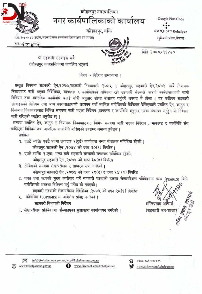 सहकारी ऐन, २०७४, सहकारी नियमावली २०७५ र कोहलपुर सहकारी ऐन, २०७४ साथै नियामक निकायबाट जारी भएका निर्देशिका, मापदण्ड र कार्यविधिको अधिनमा रही सहकारी संस्थालाई कार्य सञ्चालनका लागि विनियम तथा आन्तरिक कार्यविधि बनाई सोहीअनुसार संस्था सञ्चालन गर्न कोहलपुर नगरपालिकाले निर्देशन दिएको छ । कतिपय सहकारी संस्थाहरुको विनियम तथा अन्य कागजातहरुको अध्ययन गर्दा प्रचलित ऐन, कानुन र नियामक निकायहरुबाट विभिन्न समयमा जारी भएका निर्देशन, मापदण्ड र कार्यविधिअनुसार सञ्चालन नभएकाले यस्तो निर्देशन दिइएको कोहलपुरले जनाएको छ ।