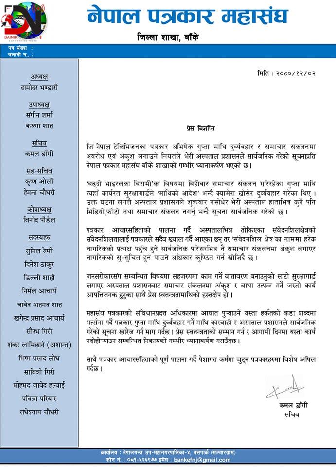 ‘जनसरोकारसंग सम्बन्धित विषयमा सहजरुपमा काम गर्ने वातावरण बनाउनुको साटो सुरक्षागार्ड लगाएर अस्पताल प्रशासनबाट समाचार संकलनमा अंकुश र बाधा उत्पन्न गर्ने जस्तो कार्य आपत्तिजनक हुनुका साथै प्रेस स्वतन्त्रतामाथिको हस्तक्षेप हो,’ बाँके शाखा सचिव कमल डाँगीद्वारा हस्ताक्षेरित विज्ञप्तिमा भनिएको छ, ‘महासंघ पत्रकारको संविधानप्रदत्त अधिकारमा आघात पुर्याउने यस्ता हर्कतको कडा शब्दमा भर्त्सना गर्दै पत्रकार गुप्तामाथि दुर्व्यवहार गर्ने माथि कारवाही र अस्पताल प्रशासनले सार्वजनिक गरेको सूचना खारेज गर्न माग गर्दछ । प्रेस स्वतन्त्रताको सम्मान गर्न र आगामी दिनमा यस्ता कार्य नदोहोयाउन सम्बन्धित निकायको गम्भीर ध्यानाकर्षण गराउँदछ ।’ साथै महासंघले पत्रकार आचारसंहिताको पूर्णपालना गर्दै पेशागत कर्ममा जुट्न पत्रकारहरुमा विशेष अपिल गरेको छ ।
