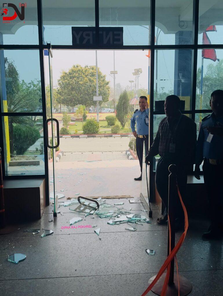 टर्मिनलभत्र जाने ढोकाको सिसा फुटेको विमानस्थल सुरक्षा गार्डका वरिष्ठ सई सन्तोष शाहले जानकारी दिए । ‘टर्मिनलको एउटा ढोकाको सिसा फुटेको छ,’ उनले भने, ‘ठूलो क्षति होइन सामान्य हो ।’ उनका अनुसार हावाहुरी लाग्दा एक छिन उडान प्रभावित भएको थियो । अहिले नियमित उडान भइरहेको छ ।