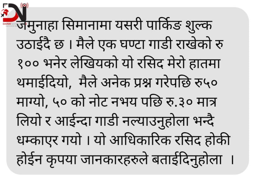 नेपाल–भारत सीमाको जमुनाह नाकामा मनपरी पार्किङ्ग शुल्क लिइएको बारे प्रजिअको मोबाइल नम्बरमा गुनासो गरिएपछि त्यसको सम्बोधन गरिएको हो ।