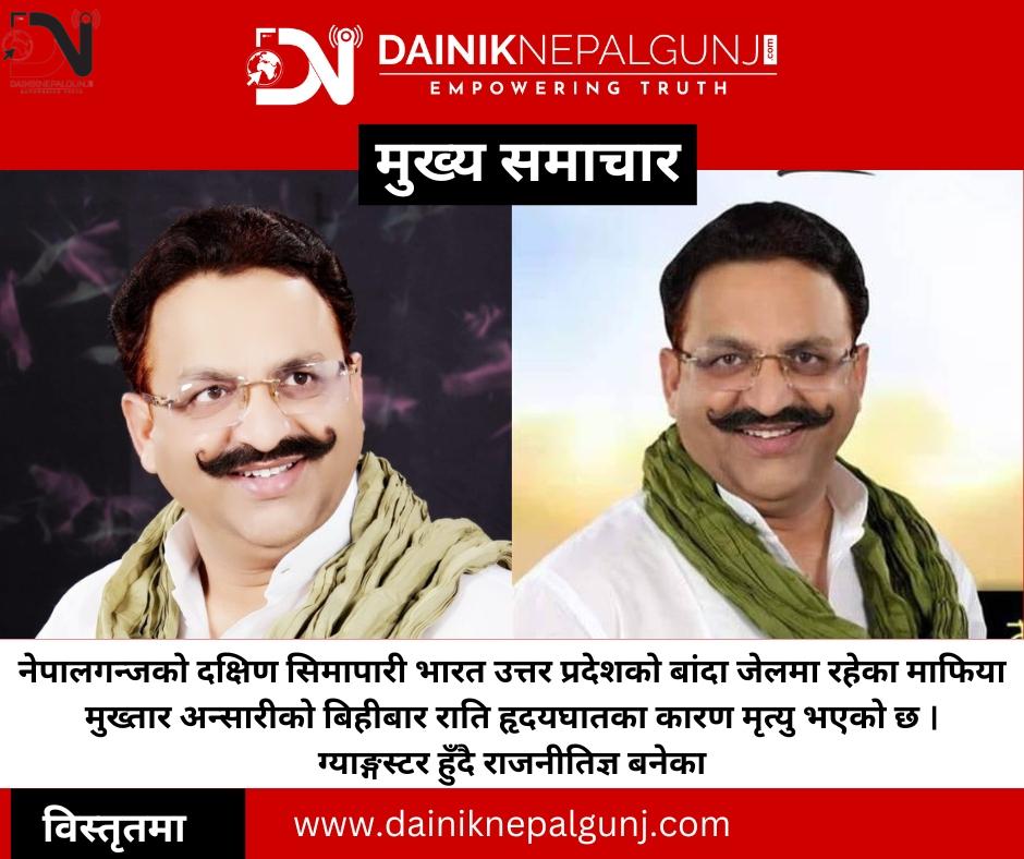 नेपालगन्जको दक्षिण सिमापारी भारत उत्तर प्रदेशको बांदा जेलमा रहेका माफिया मुख्तार अन्सारीको बिहीबार राति हृदयघातका कारण मृत्यु भएको छ ।