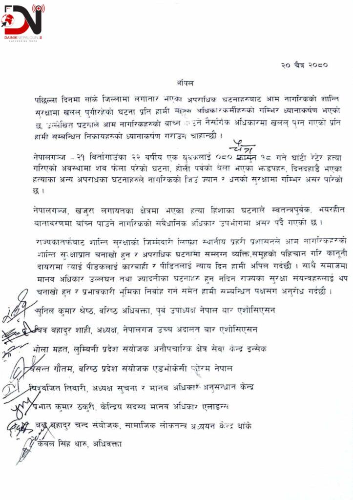 नेपालगन्ज – २१ विर्तागाउँका २२ वर्षीय एक युवकलाई ०८० चैत्र १८ गते घाँटी रेटेर हत्या गरिएको अवस्थामा शव फेला परेको घटना, होली पर्वको बेला भएका झडपहरू, दिनदहाडै भएका हत्याका घटनाहरूले नागरिकको जिउँ ज्यान र धनको सुरक्षामा गम्भीर असर पारेको छ । नेपालगन्ज, खजुरा लगायतका क्षेत्रमा भएका हत्या हिंशाका घटनाले स्वतन्त्रपूर्वक, भयरहित वातावरणमा बाँच्न पाउने नागरिकको संवैधानिक अधिकार उपभोगमा असर पर्दै गएको अधिकारकर्मीले बिज्ञप्तीमा जनाएका छन् ।