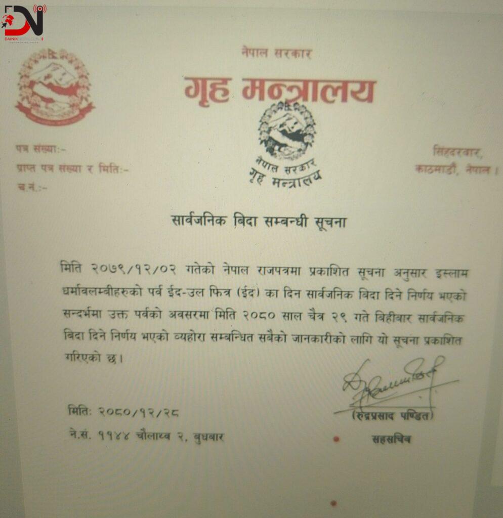 ईदका अवसरमा सरकारले भोलि बिहीबार सार्वजनिक बिदा दिएको छ ।