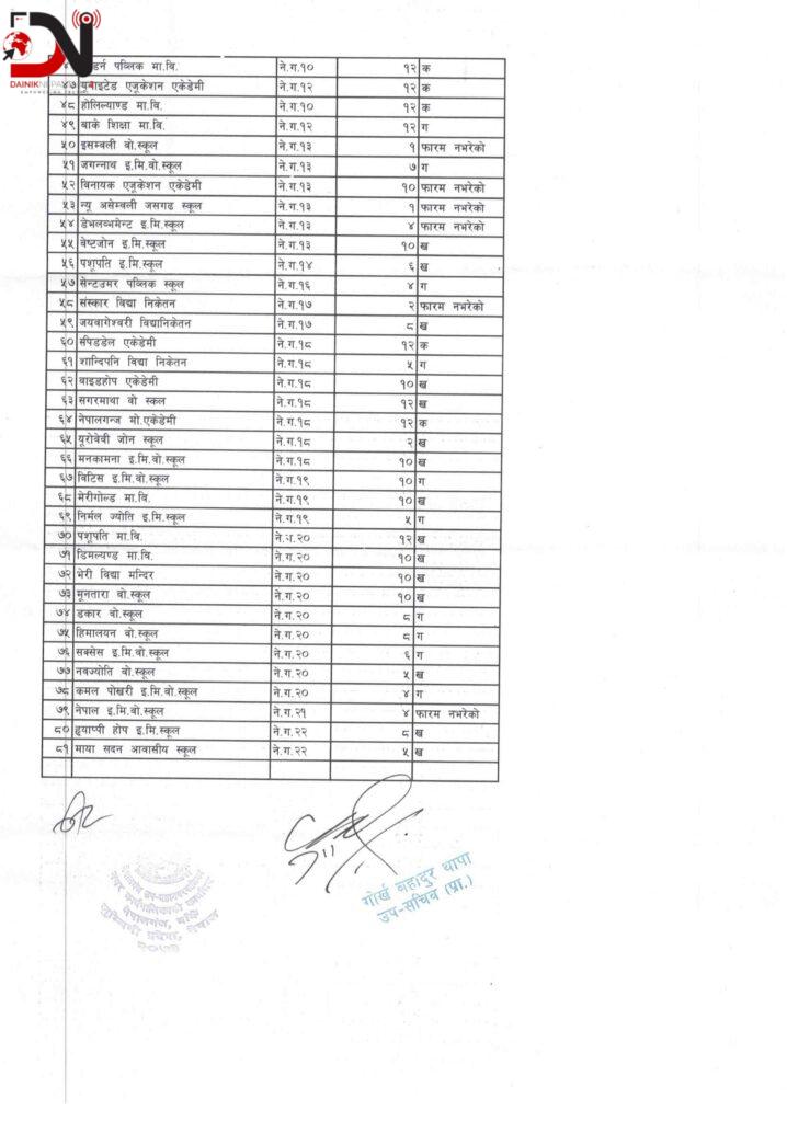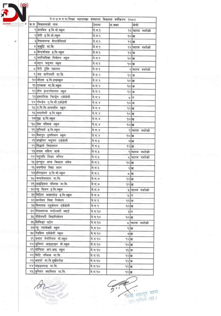 नेपालगन्ज उपमहानगर–पालिकामा ८१ विद्यालय रहेका छन् । जसमध्ये प्रक्रिया पूरा नगरेका केही विद्यालयको मापदण्ड मूल्यांकन रोकिएको छ, उनीहरूले ५ हजार जरिवाना तिरेर फारम भर्न सक्ने व्यवस्था उपमहानगरपालिकाको शिक्षा महाशाखाले गरेको छ । वर्गीकरणका लागि स्वमूल्यांकन फाराम नभर्ने विद्यालय १४ वटा छन् ।