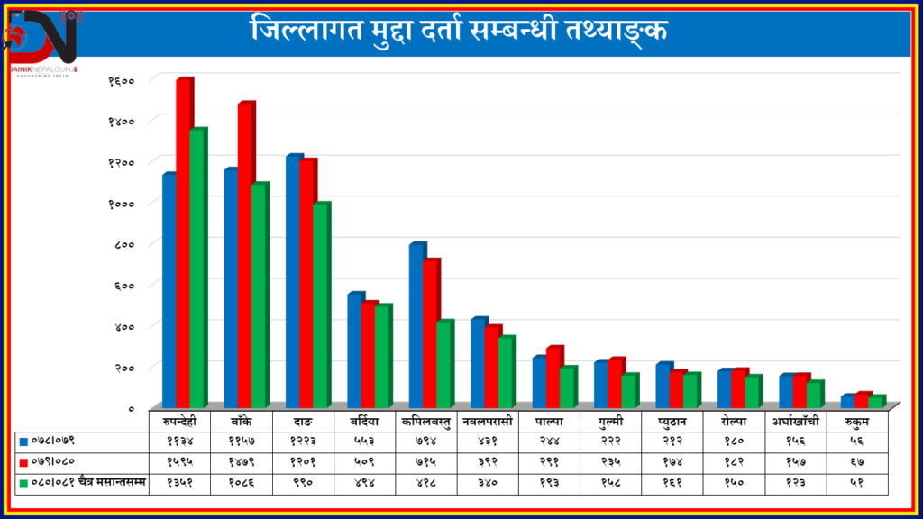 लुम्बिनी प्रदेश प्रहरीका अनुसार, चालु आ.व.को नौ महिनामा बाँकेमा १ हजार ८६, दाङ्गमा ९ सय ९०, बर्दियामा ४ सय ९४, कपिलवस्तुमा ४ सय १८, नवलपरासीमा ३ सय ४०, पल्पामा १ सय ९३, गुल्मीमा १ सय ५८, प्युठानमा १ सय ६१, रोल्पामा १ सय ५०, अर्घाखाँचीमा १ सय २३ मुद्दा दर्ता भएका हुन् ।