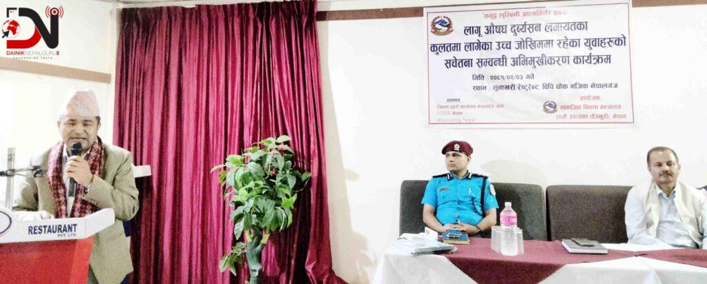 कार्यक्रममा आफ्नो प्रस्तुति राख्दै बाँके प्रहरी प्रवक्ता प्रहरी नायब उपरीक्षक नारायण डाँगीले लहैलहै, रमाइलोमा लागुऔषध सेवन गर्नेहरू पछि त्यसलाई त्याग्न नसक्ने अवस्थामा पुग्ने गरेको बताए । उनले प्रहरीले जिल्लामा लागुऔषध विरुद्ध सुधारात्मक र मागमा कमी ल्याउन कार्यक्रम गरिरहेको तथा लागुऔषध विरुद्ध कानुनी कारवाही पनि गरिरहेको जानकारी दिए ।
