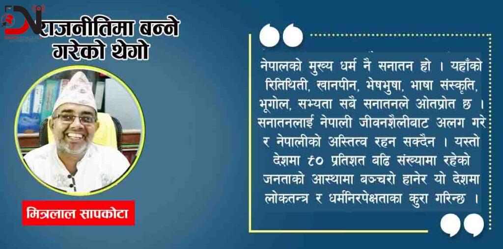 नेपालको मुख्य धर्म नै सनातन हो । यहाँको रितिथिती, खानपीन, भेषभुषा, भाषा संस्कृति, भूगोल, सभ्यता सबै सनातनले ओतप्रोत छ । सनातनलाई नेपाली जीवनशैलीबाट अलग गरेर नेपालीको अस्तित्व रहन सक्दैन । यस्तो देशमा ९० प्रतिशत बढि संख्यामा रहेको जनताको आस्थामा बञ्चरो हानेर यो देशमा लोकतन्त्र र धर्मनिरपेक्षताका कुरा गरिन्छ । बहुसंख्यकको अपमान गरेर उनका आस्थाकेन्द्रमा ढुङ्गा हानेर लोकतन्त्रका कुरा गरिन्छ । बहुसंख्यक जनताले आफ्नो धर्म सँस्कृति र आस्था जोगाउन आवाज उठाउँदा ‘धर्म निरपेक्षता खतरामा भयो’ भनिन्छ ।