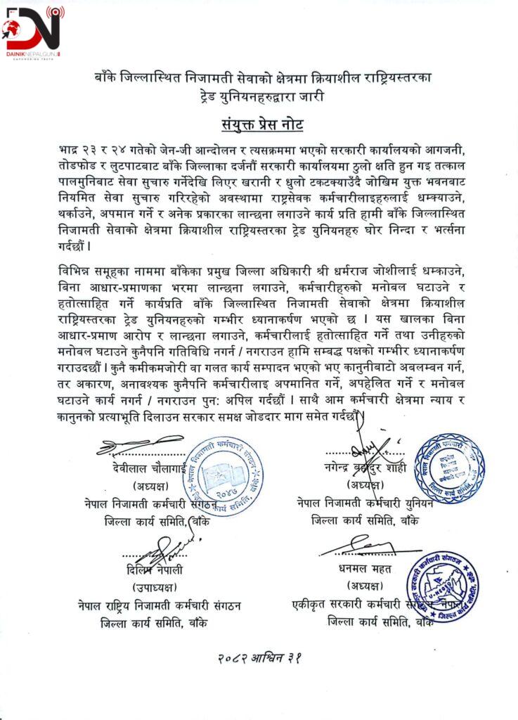 बाँके जिल्लामा रहेका विभिन्न निजामती ट्रेड युनियनहरू — नेपाल निजामती कर्मचारी संगठन, नेपाल राष्ट्रिय निजामती कर्मचारी संगठन, नेपाल निजामती कर्मचारी युनियन र एकीकृत सरकारी कर्मचारी संगठन — ले शुक्रबार संयुक्त विज्ञप्ति जारी गरेका हुन् ।