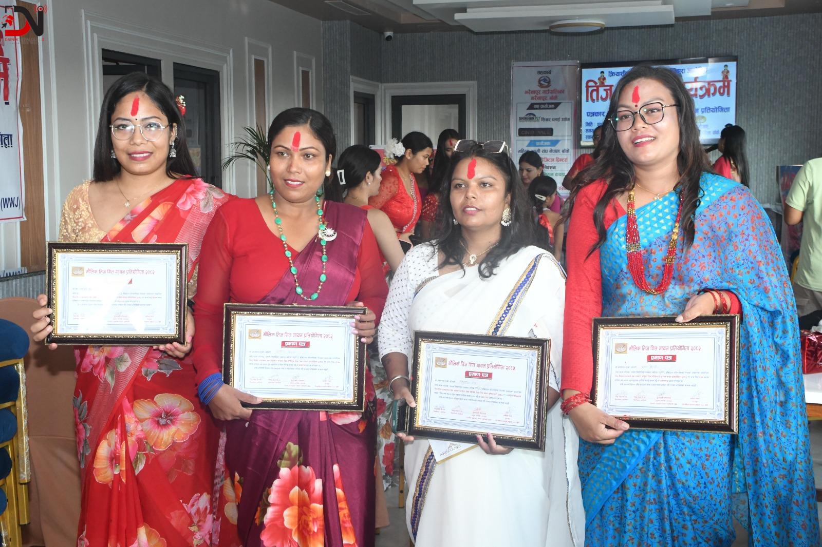 आजको पत्रकार महिला बीच गरिएको मौलिक तिज गित प्रतियोगितामा धना केसी प्रथम हुनुभएको छ । यसैगरी द्धितिय शान्ति सुनार ,तृतिय अनिता विश्वकर्मा र सान्त्वना विद्युतमा रैका हुनुभएको छ । प्रथम ,द्धितिय ,तृतिय र सान्त्वना लाई क्रमश ३ हजार ,२ हजार ,१५ सय र १ हजार रुपैया प्रदान गरिएको क्रियाशिल पत्रकार महिला बाँकेका सचिव निशु जोशिले जानकारी दिनुभयो । कार्यक्रममा स्वागत मन्तब्य क्रियाशिल पत्रकार महिला बाँकेका उपाध्यक्ष विमला चौधरीले दिनुभएको थियो । कार्यक्रमलाई सम्बोधन गर्दे क्रियाशिल पत्रकार महिला बाँकेका अध्यक्ष साबित्री गिरीले यस्ता मौलिकता जनाउने कार्यक्रम आगामी दिनमा पनि संचालन गरिने बतउनुभयो । यसका साथै पत्रकार महिलाको क्षमता अभिबृद्धिका कार्यक्रमहरु पनि नियमित गर्ने बताउनुभयो ।